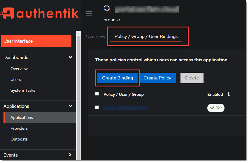 Optionally, bind the group to control access to the organizr to the application.